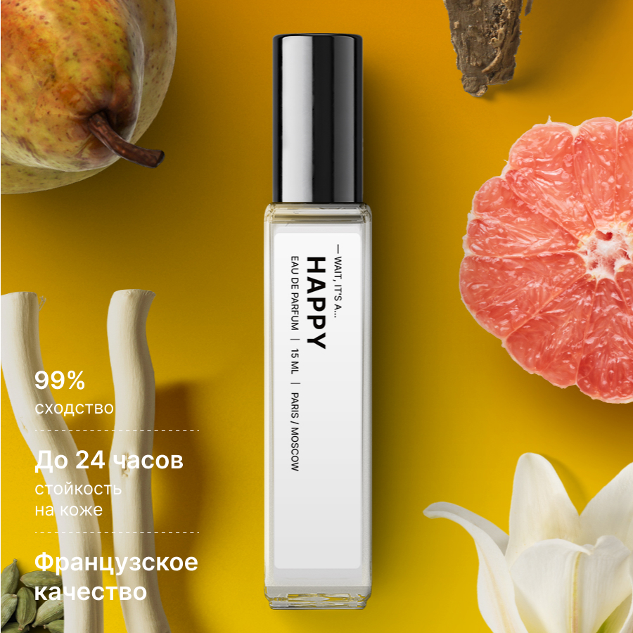 Фрукты и цветы, мускус и дерево – образцовое сочетание нот в парфюме Happy, которое символизирует мировые парфюмерные традиции. Это аромат Италии, где чувственное наслаждение становится философией и возводится на уровень искусства. Аккорды зеленого мандарина и бергамота приглашают в мир энергии и свежести. Цветочная нежность исходит от ноток жасмина, кардамона и нарцисса. Сандал и мускус дарят уверенности. Такой баланс разве ли не счастье?