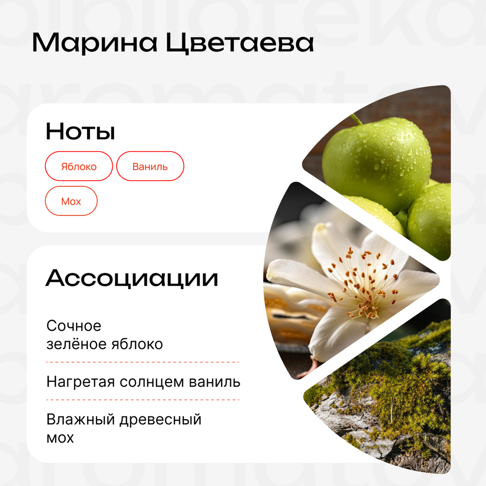 Марина влюбилась в будущего мужа своей сестры. Чувства, так и не ставшие взаимными, подарили миру легендарные строки. Как и стихотворение пронизано кротостью, простотой и светлой печалью, так и в аромате сплетаются ноты свежего яблока, горького мха и трогательной ванили.