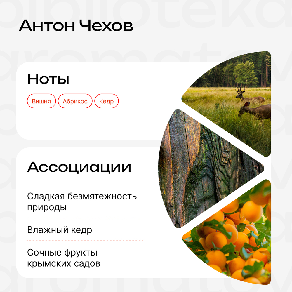 Если бы писатель занимался бытом, то, наверное, не подарил свои шедевры, смысл которых актуален и в наше время. Поэтому Чехов гуляет в Ялте, вдыхает насыщенные ароматы и вдохновляется на новые тексты. Во флаконе мы заключили ноты сладкой безмятежности и природы – сочные фрукты крымских садов и влажный кедр.