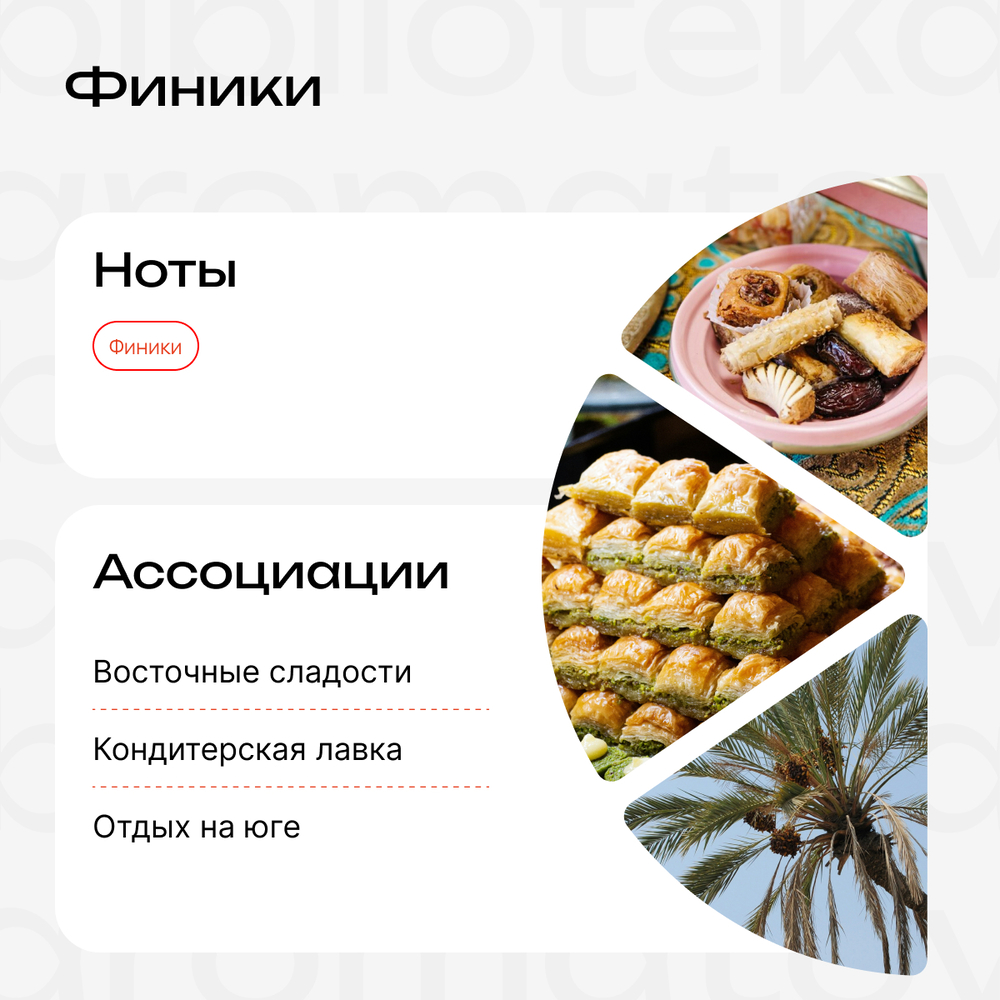 Мало кто знает, что аромат фиников напоминает запах шоколадной конфетки с ликёром. Не верите? Откройте флакон и сделайте вдох. Но будьте осторожны, аромат настолько густой и сладкий, что на языке появится послевкусие и срочно захочется десерта. С финиками, разумеется.