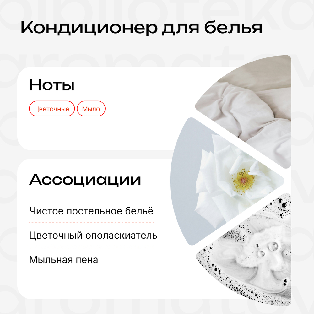 Вспомните этот запах, что расстилается по квартире нежным облаком, когда достали бельё из стирки и педантично развесили сушиться. Аромат, который доносится от влажных, чистых простыней дарит ощущение покоя и одновременно воодушевляет. А чистота ассоциируется у нас со здоровьем, поэтому мы создали аромат, где сплетаются эти ощущения. "Кондиционер для белья" – то, что поможет смыть лишние эмоции.
