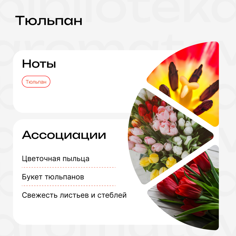 "Тюльпан" – аромат, передающий чистую сущность этого цветка. Никаких дополнительных добавок, никаких причудливых смесей, только искрящаяся нота цветка. Это как держать букет свежих тюльпанов прямо под носом без необходимости их поливать. К сожалению, аромат этого цветка часто недооценивают в парфюмерной сфере. Он не так популярен, как роза, жасмин или сирень. Пришло время оценить "Тюльпан" по достоинству за его простоту и чистоту.
