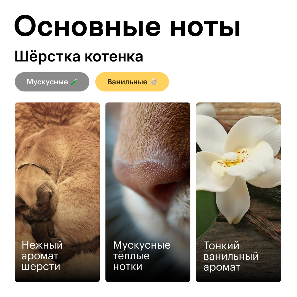 Мы создали аромат "Шёрстка котёнка", чтобы в любой момент вы почувствовали прилив нежности и спокойствия. Сладкий аромат с нотами мускуса и ванили способен подарить столько же добра, сколько и настоящий маленький котёнок.
