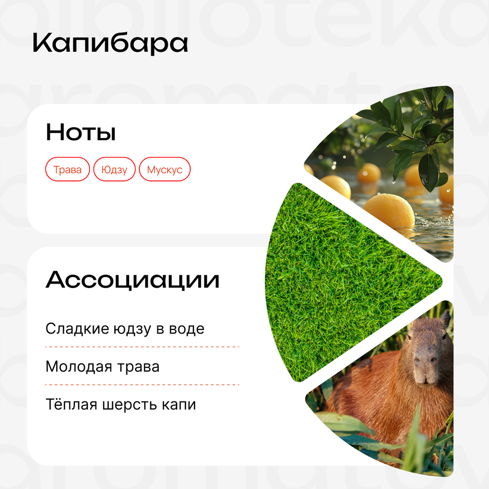 Любить капибар – это увлечение. Быть как капи – это уже искусство. Поэтому, чтобы вы всегда чувствовали дзен в потоке жизни и не выходили из равновесия, мы создали особый аромат. Раскрыли в композиции те самые горячие источники с сочными юдзу, и, конечно, добавили к ним ноты тёплого мускуса и свежей травы. Знакомьтесь ближе с ароматом, в котором капи знают толк.