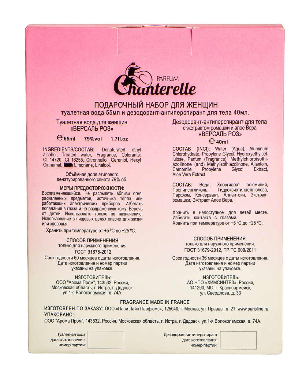 | Изготовитель | ООО "Пари Лайн Парфюмс", Россия, 125040, г. Москва, ул. Правды, д. 21 |