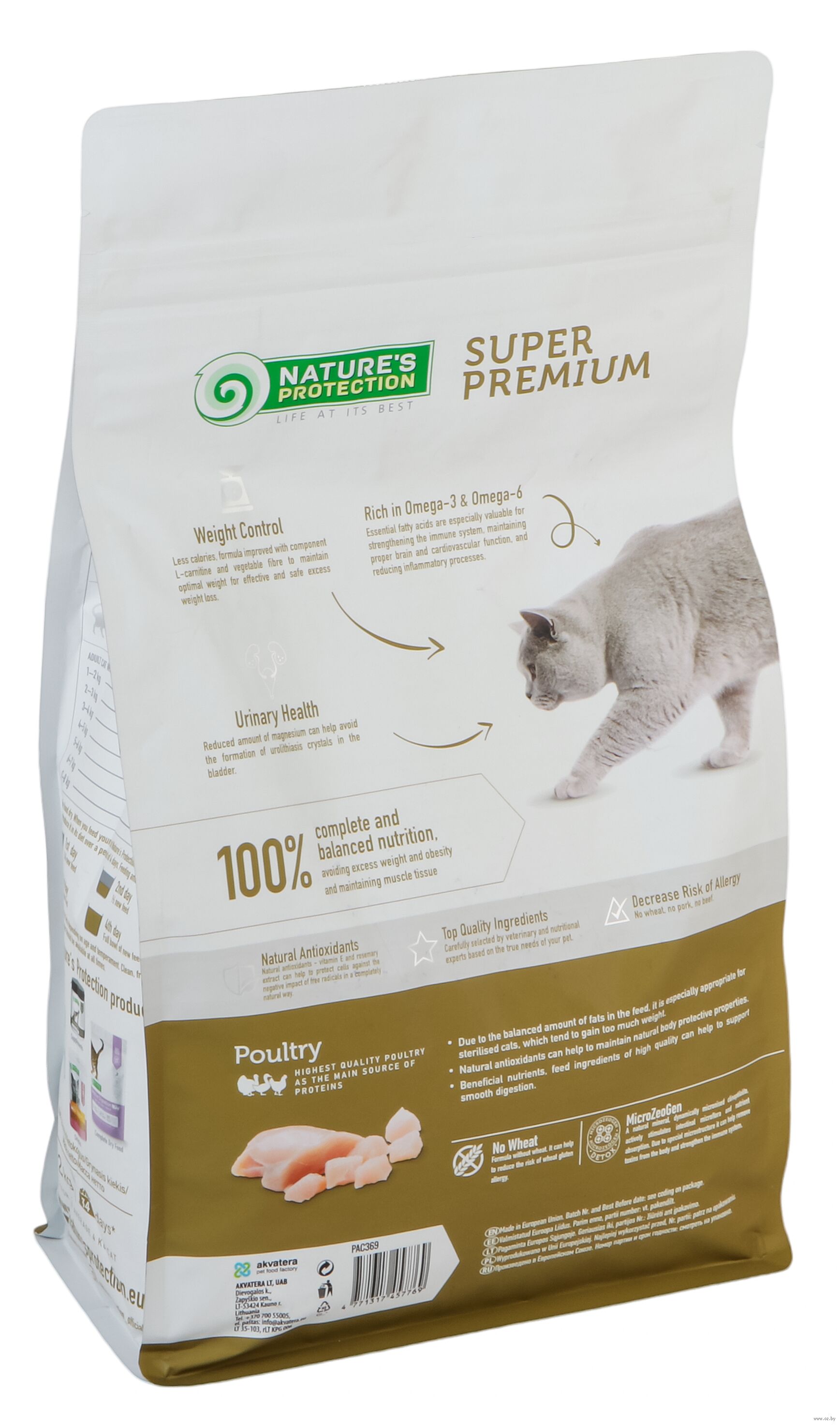 Через сбалансированное количество жиров корм особенно подходит для стерилизованных котов, которые, как правило, склонны набирать лишний вес. Меньше калорий: формула улучшена с помощью компонента L-карнитин и растительных волокон для поддержания оптимального веса, для эффективного и безопасного похудения.