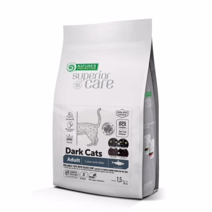 Nature's Protection Superior Care Dark Cats Grain Free with Herring for Adult All Breeds – это полноценный и сбалансированный сухой корм для кошек всех пород с темным окрасом супер-премиум класса с источником белка высочайшего качества. Тщательно отобранные и хорошо сбалансированные ингредиенты корма делают структуру слез и слюны прозрачной и помогают защитить шерсть кошки от коричневых пятен. Этот полноценный сухой корм, изготовленный по специальной формуле Dark Coat Enhancer (DCE), помогает защитить и усилить черный пигмент шерсти вашей кошки.