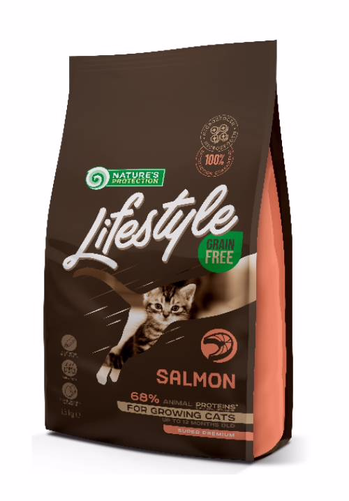 Nature's Protection Lifestyle Kitten (лосось) – это полнорационный беззерновой корм для котят до 12 месяцев с лососем.