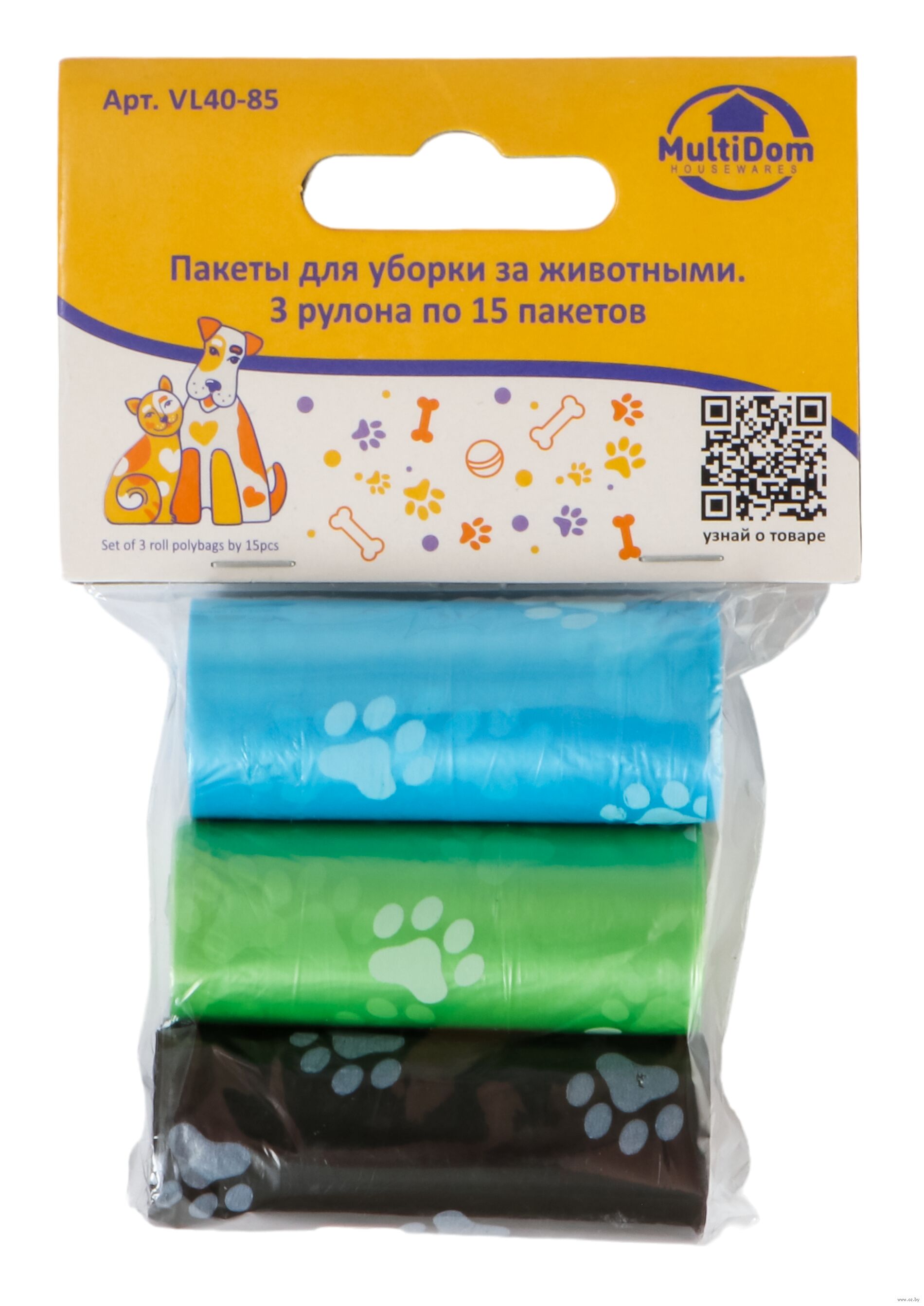 Способ применения: оторвите пакет от рулона и наденьте его на руку; уберите фекалии, вывернув пакет наизнанку; завяжите и выбросьте пакет в мусорный контейнер.