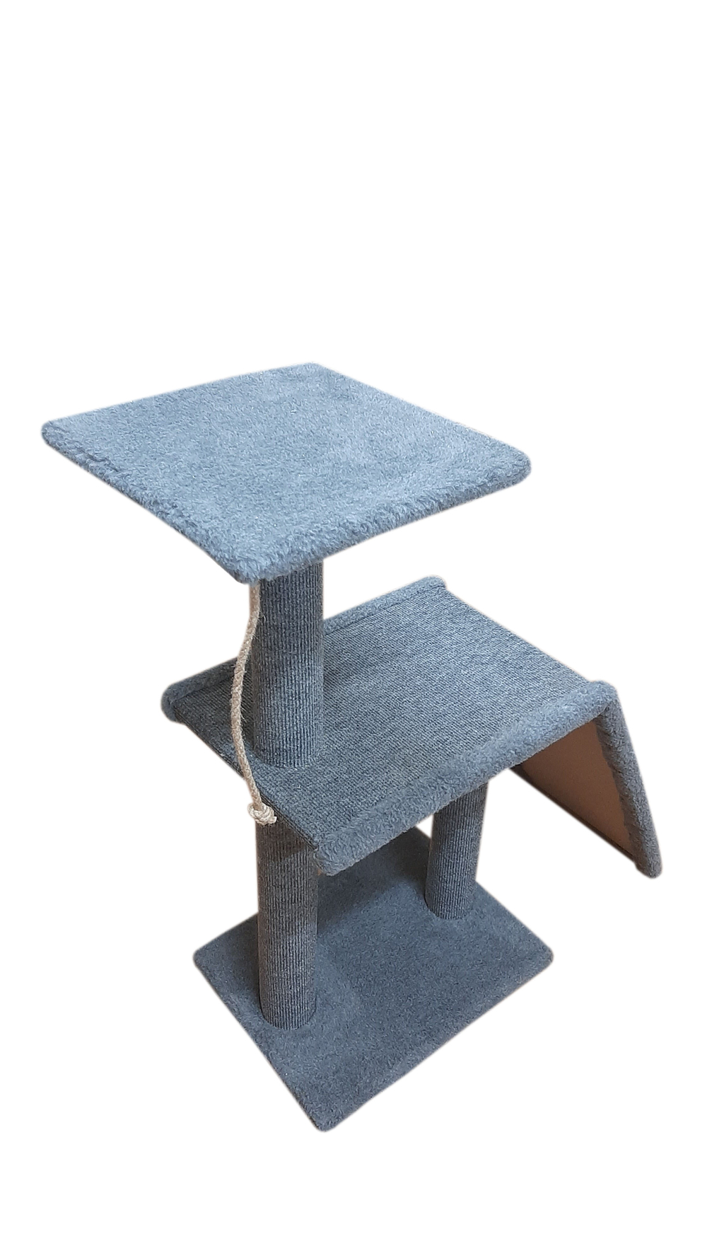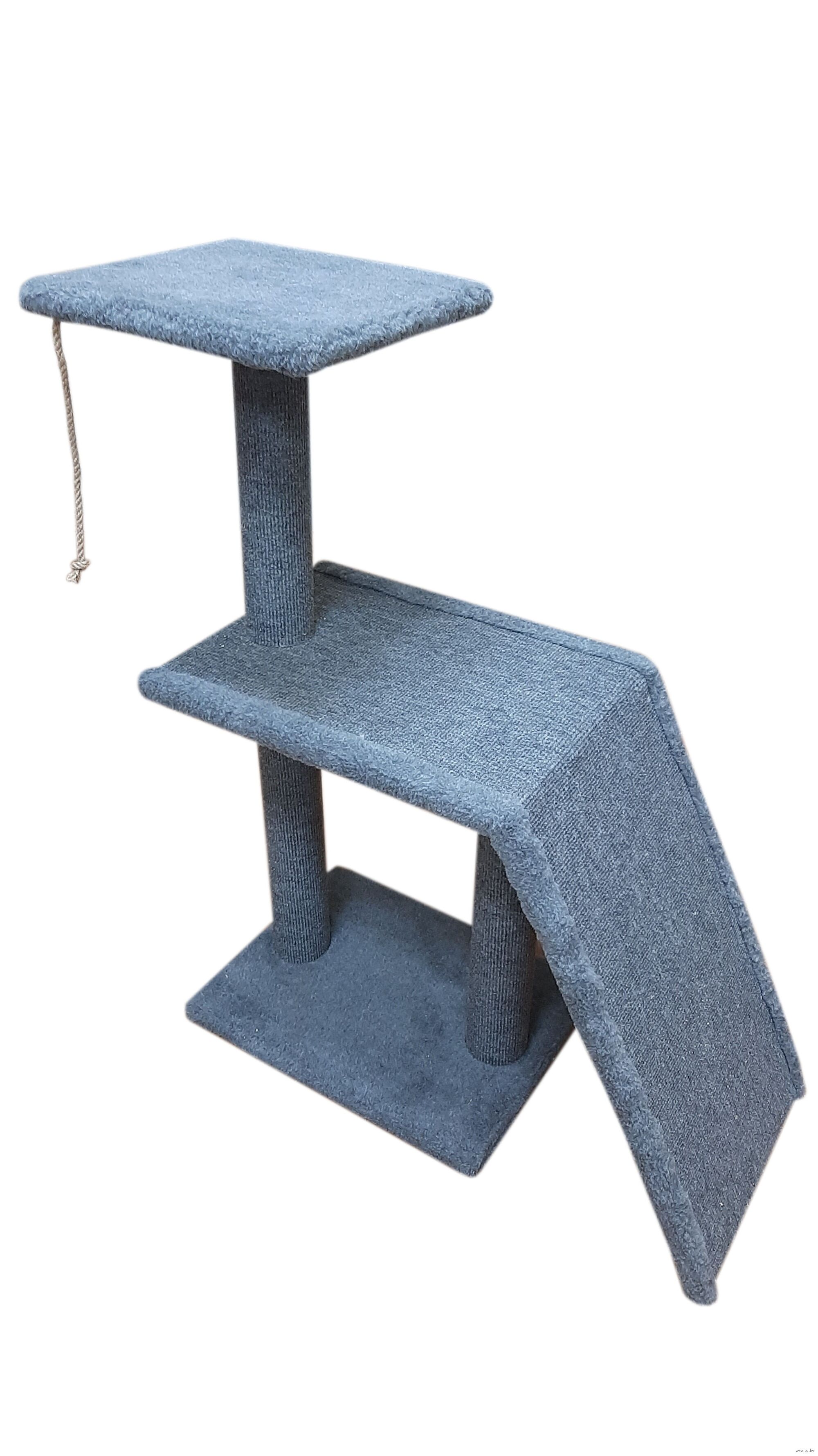 Комплекс обеспечит кошку местом для отдыха, благодаря удобным полкам на разных уровнях, а также позволит точить когти, используя столбики-когтеточки и наклонную поверхность из ковролина.
