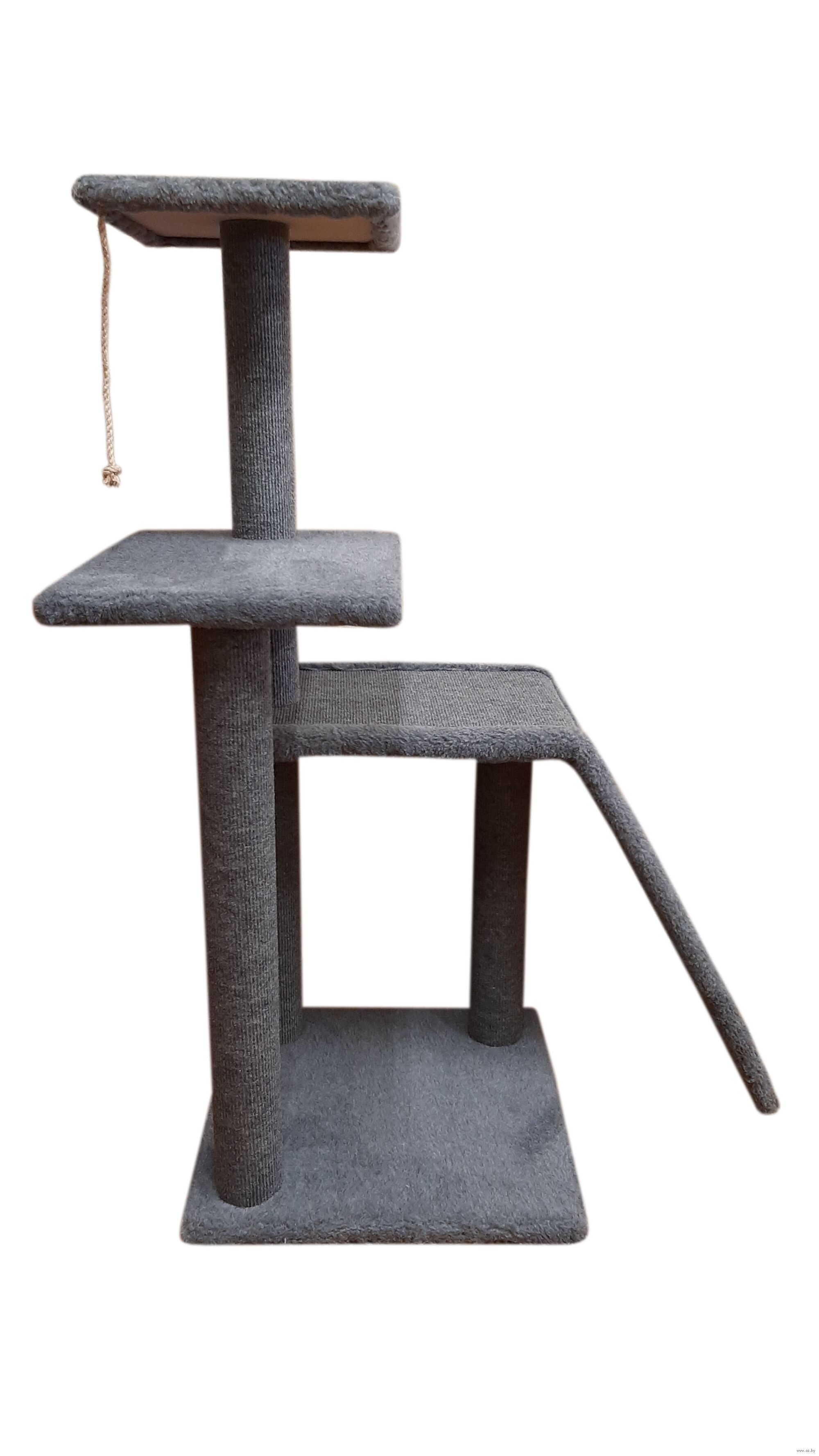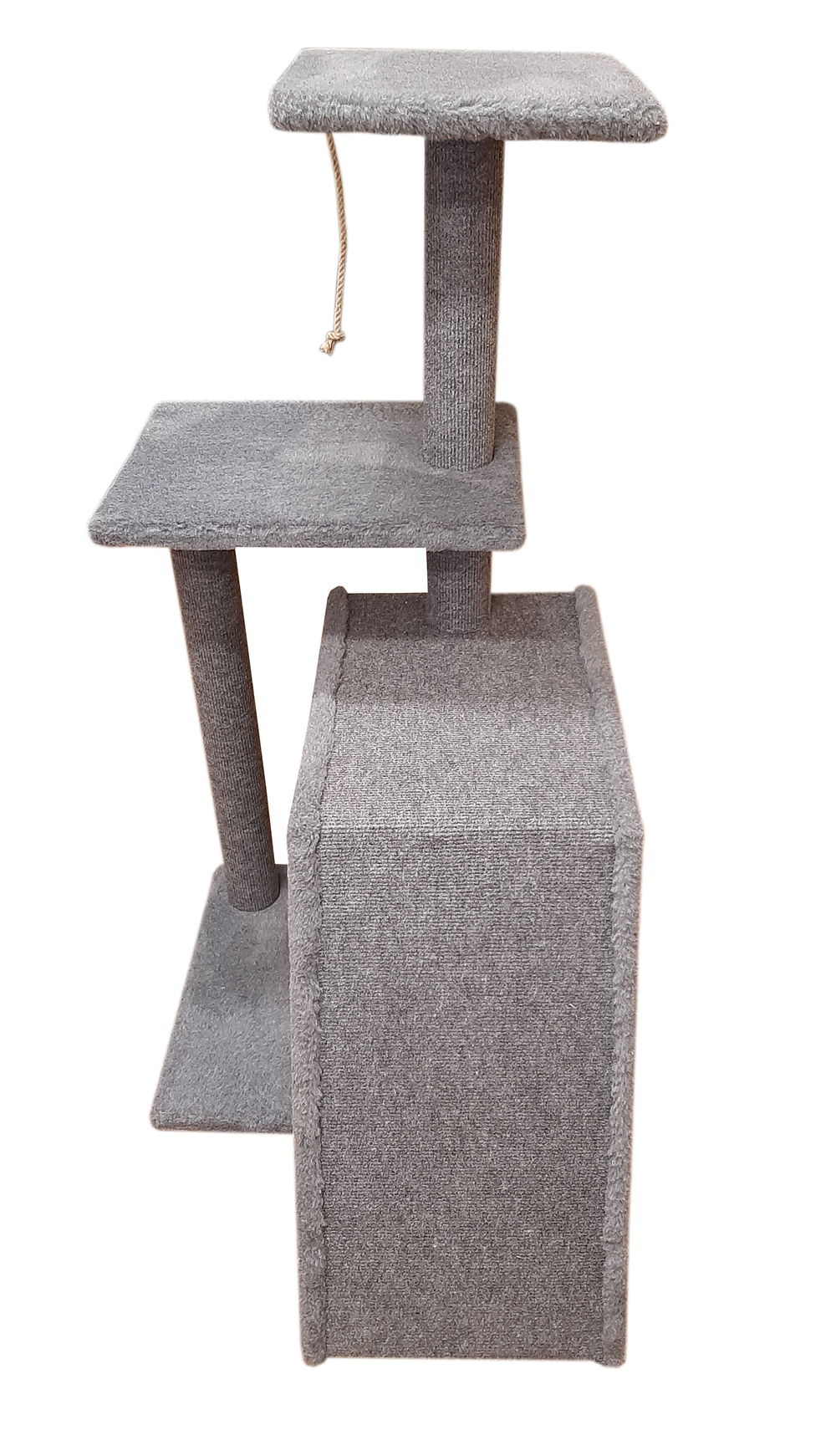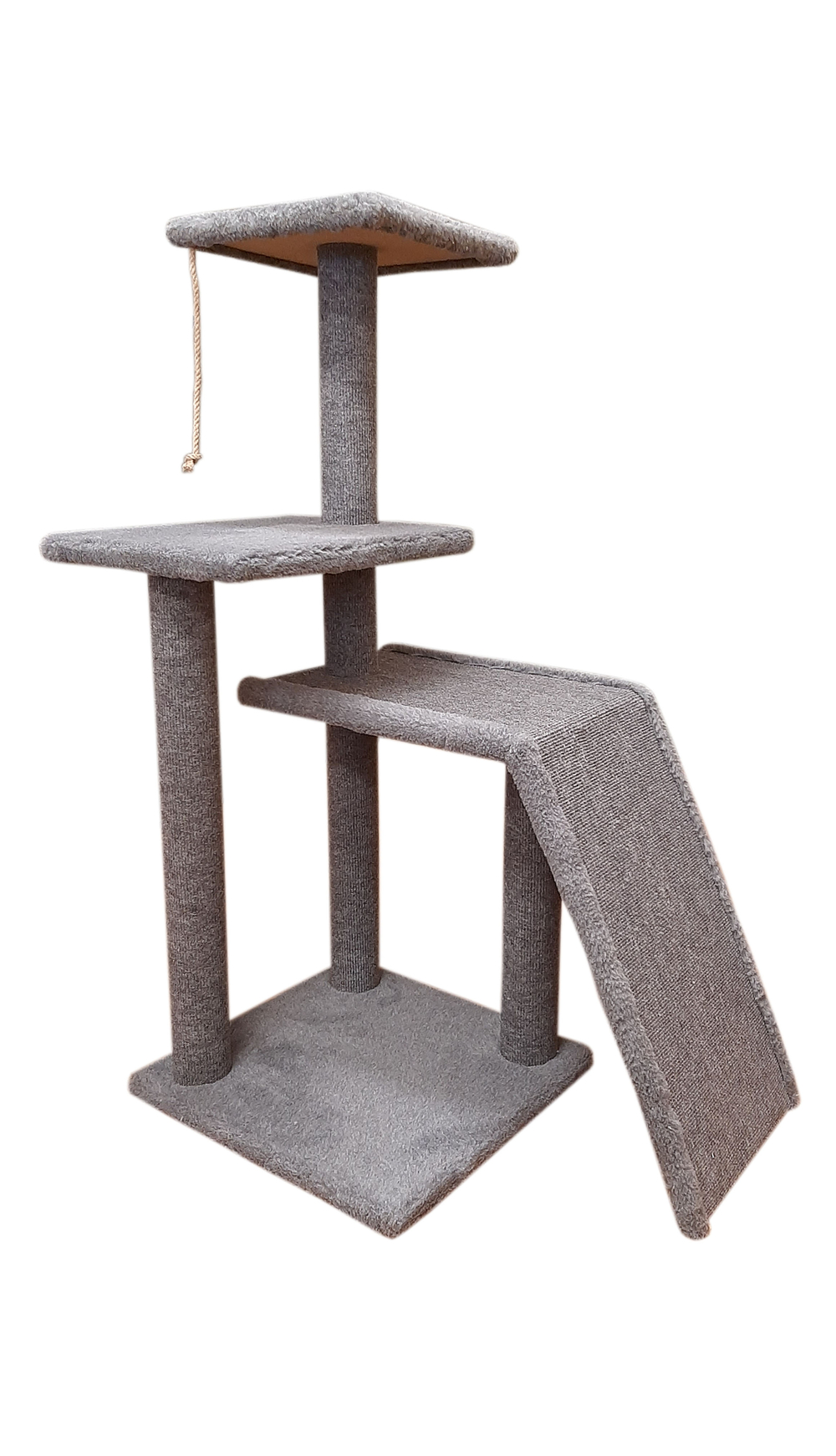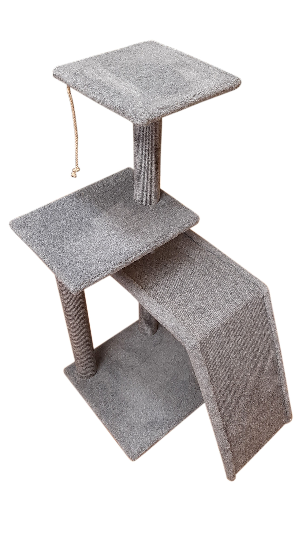 Комплекс обеспечит кошку местом для отдыха, благодаря удобным полкам на разных уровнях, а также позволит точить когти, используя столбики-когтеточки и наклонную поверхность из ковролина.