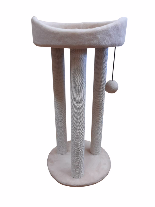 Верхний уровень отдан под комфортный лежак, обтянутый плюшем. К нему прикреплена игрушка на веревочке, которая привлечет внимание кота.