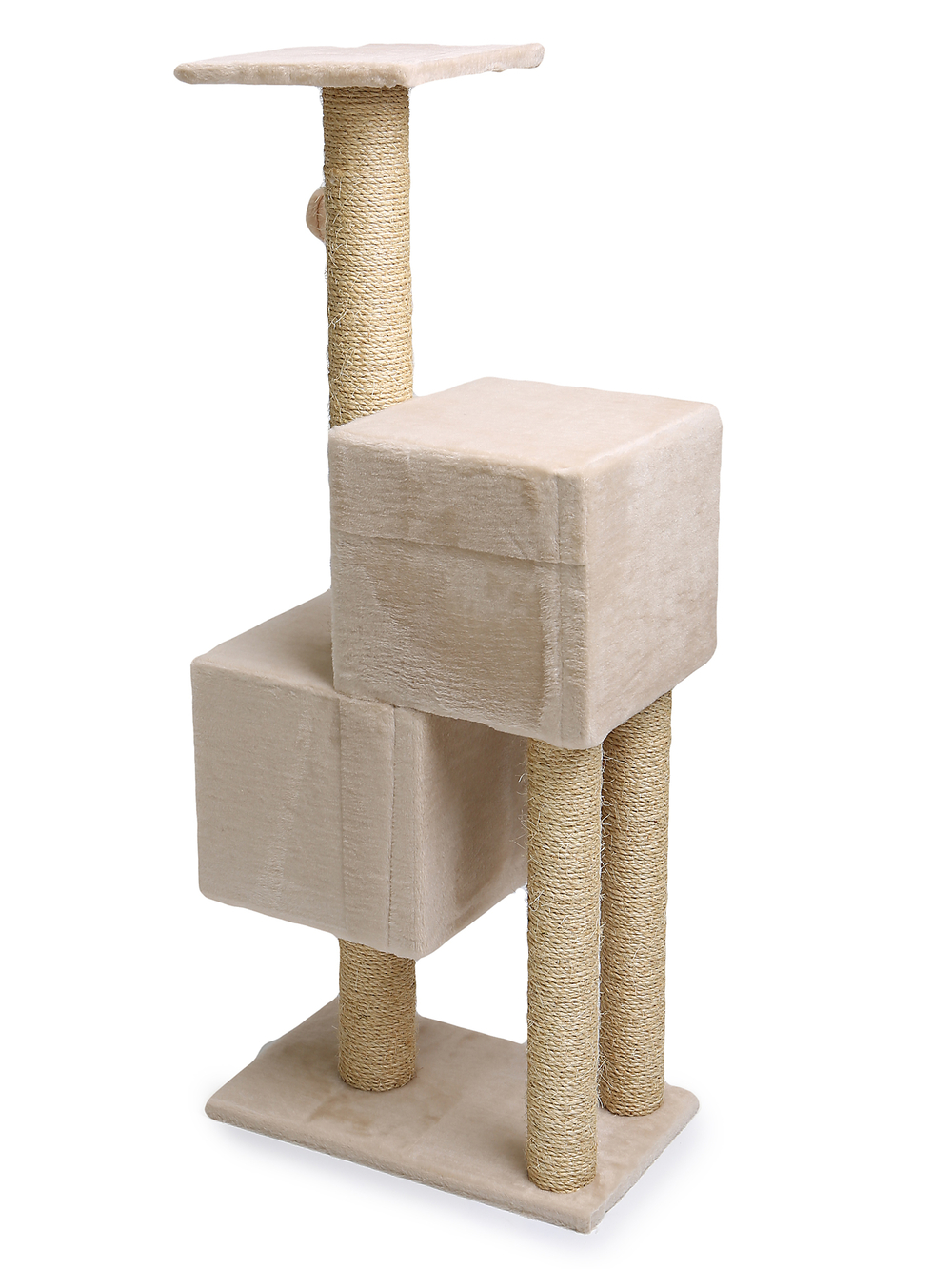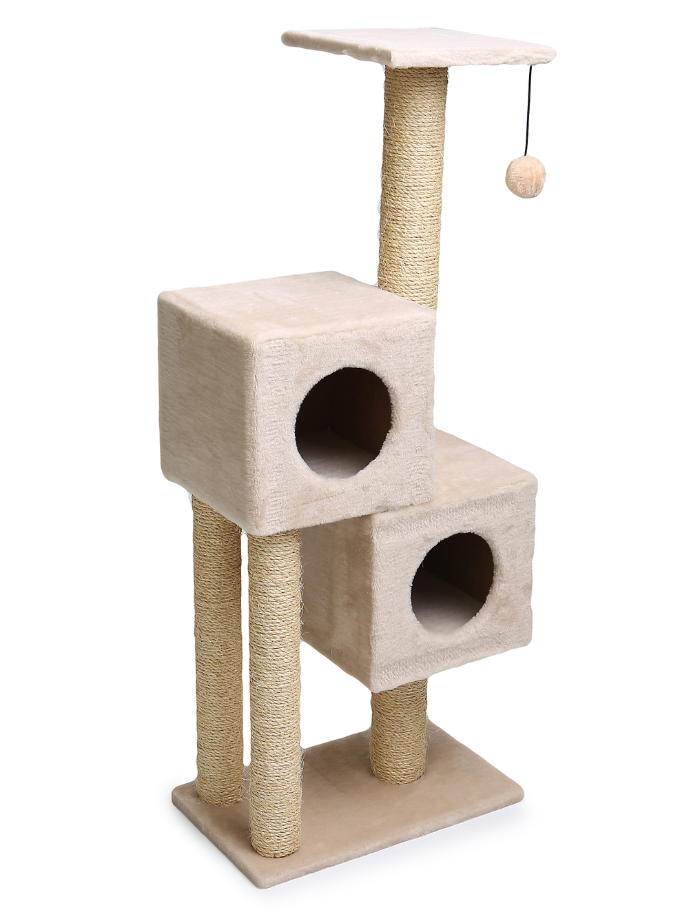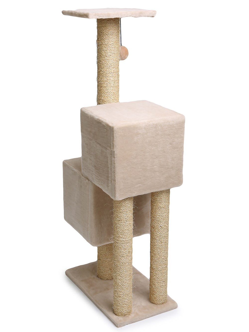 Все детали покрыты мягким плюшем, столбики обкручены сизалем. Он нежно снимает верхний слой когтя и не травмирует подушечки лап кота.