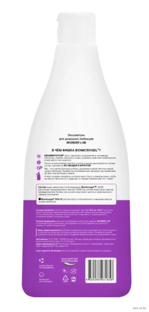Экошампунь "Wonder Lab" одобрен профессиональными грумерами. Шампунем также можно мыть и других питомцев, например, мини-пигов. Экосредства "Wonder Lab" созданы на основе инновационного компонента Biomicrogel, который сделан из овощей и фруктов. Средства "Wonder Lab" не вредят окружающей среде, не содержат опасных компонентов и разлагаются на 98% за 1 день.