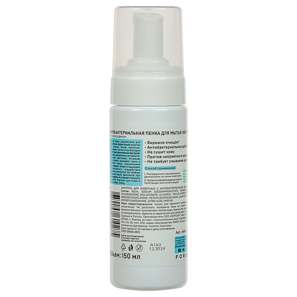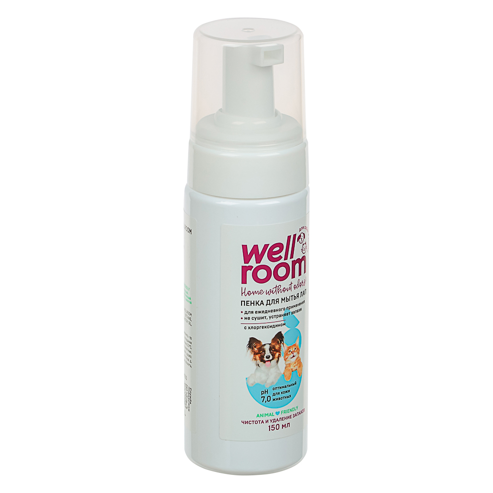 Пенка для мытья лап "Wellroom" с пантенолом, 150 мл подходит для собак и кошек. Специальная формула с пантенолом и хлоргексидином бережно очищает, обладает выраженным антибактериальным эффектом и не сушит кожу.