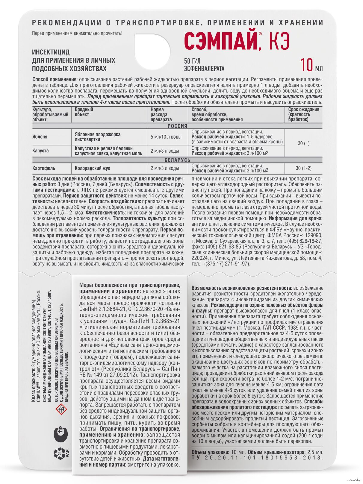Благодаря улучшенной препаративной форме, содержащей прилипатель, Сэмпай надежно удерживается на листьях обработанных растений, при этом период его защитного действия составляет не менее 2-х недель. Кроме яблонь Сэмпай пригодится на капусте в борьбе с гусеницами белянок, совок и моли.