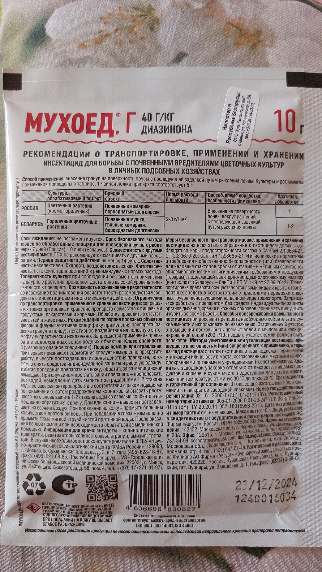 Высокоэффективное средство против вредителей овощных культур и комнатных растений "Мухоед" способно уничтожать как взрослых насекомых, так и их личинки.