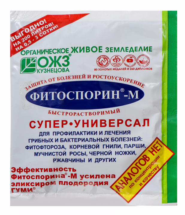 Биофунгицид, в основе которого – полезные фитобактерии в споровой форме, проникающие в ткани растений и вырабатывающие биологически активные вещества для их защиты и стимуляции. Защищает от гнилей, парши, черной ножки, фузариоза, фитофтороза, фомоза, серой гнили, ризоктониоза, альтернариоза, бактериозов, пероноспороза, мучнистой росы, ржавчины, септориоза и др. болезней. Содержит эликсир плодородия Гуми.