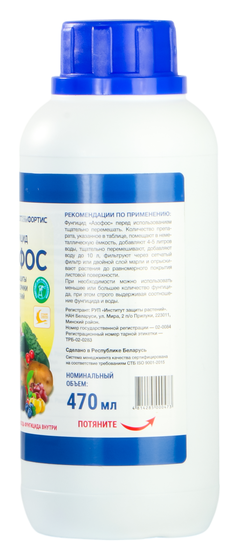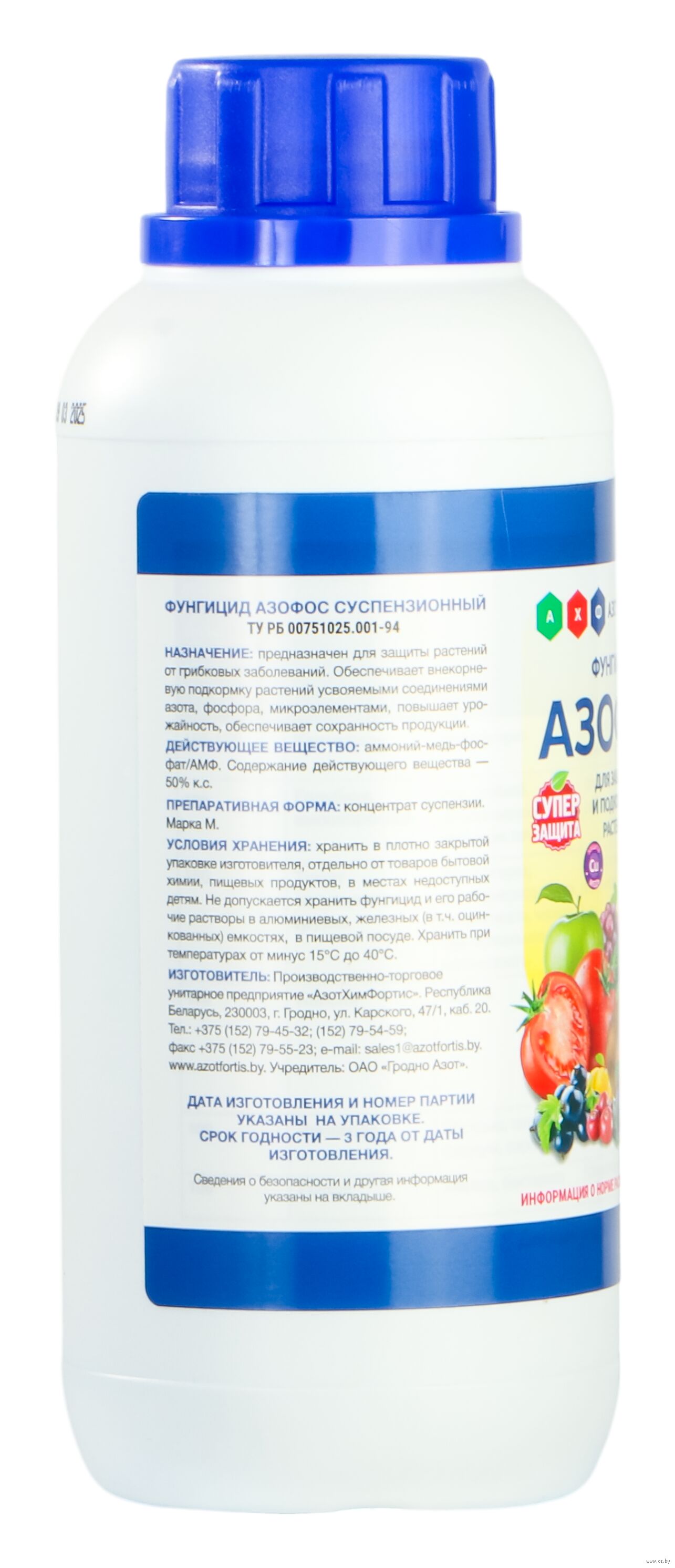 Фунгицид суспензионный "Азофос марка М" предназначен для защиты растений (картофеля, томатов в защитном грунте, огурцов в защитном грунте, вишни, сливы, алычи, черной смородины, клюквы крупноплодной, брусники обыкновенной, яблони) от грибковых заболеваний. Действующим веществом фунгицида являются медьсодержащие фосфаты аммония сложного состава.