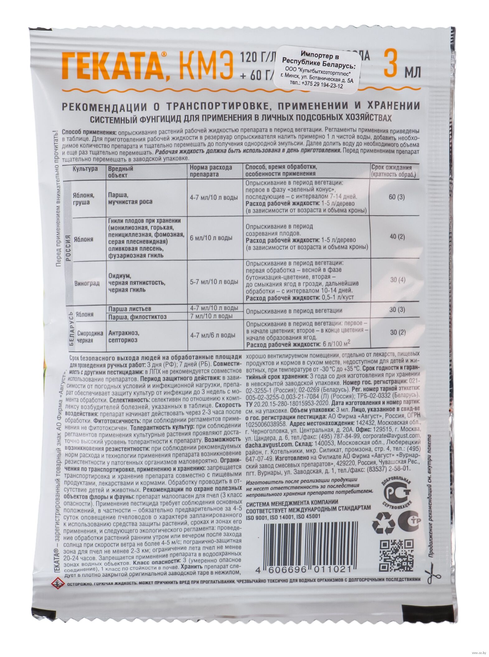 "Геката" – комбинированный препарат от комплекса болезней на плодовых, ягодных культурах и винограде. Инфекции сада, гнили портят плоды, сокращают срок хранения, снижают урожайность и могут даже привести к гибели растения. Зараженные яблоки и груши выделяют токсины, вредные для человека. "Геката" содержит уникальное сочетание действующих веществ, что позволяет эффективно лечить и защищать от болезней, не вызывая привыкания у возбудителей инфекции.