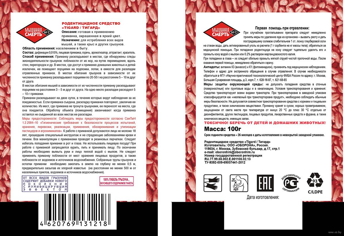 Приманка в виде зерна злаковых культур, с содержанием яда, предназначена для борьбы с мышами, крысами и другими грызунами. Зерно является привычной едой для грызунов, поэтому начало поедания приманки после раскладки очень быстрое. Средство обладает высокой родентицидной активностью, гибель грызунов наступает на 3-7 день после поедания приманки.