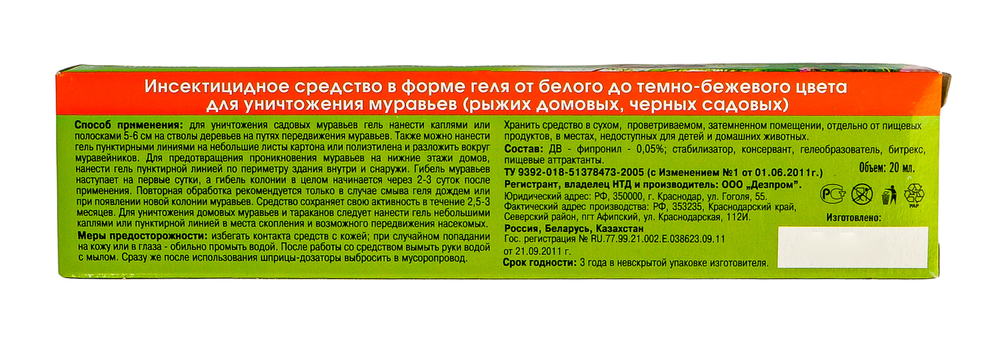 Гель представляет собой однородную бесцветную желеобразную массу, помещенную в контейнер-дозатор. Действующим веществом его является хлорпирифос – высокоактивное фосфоро-органическое соединение с кишечно-контактной активностью – в количестве 0,5%.