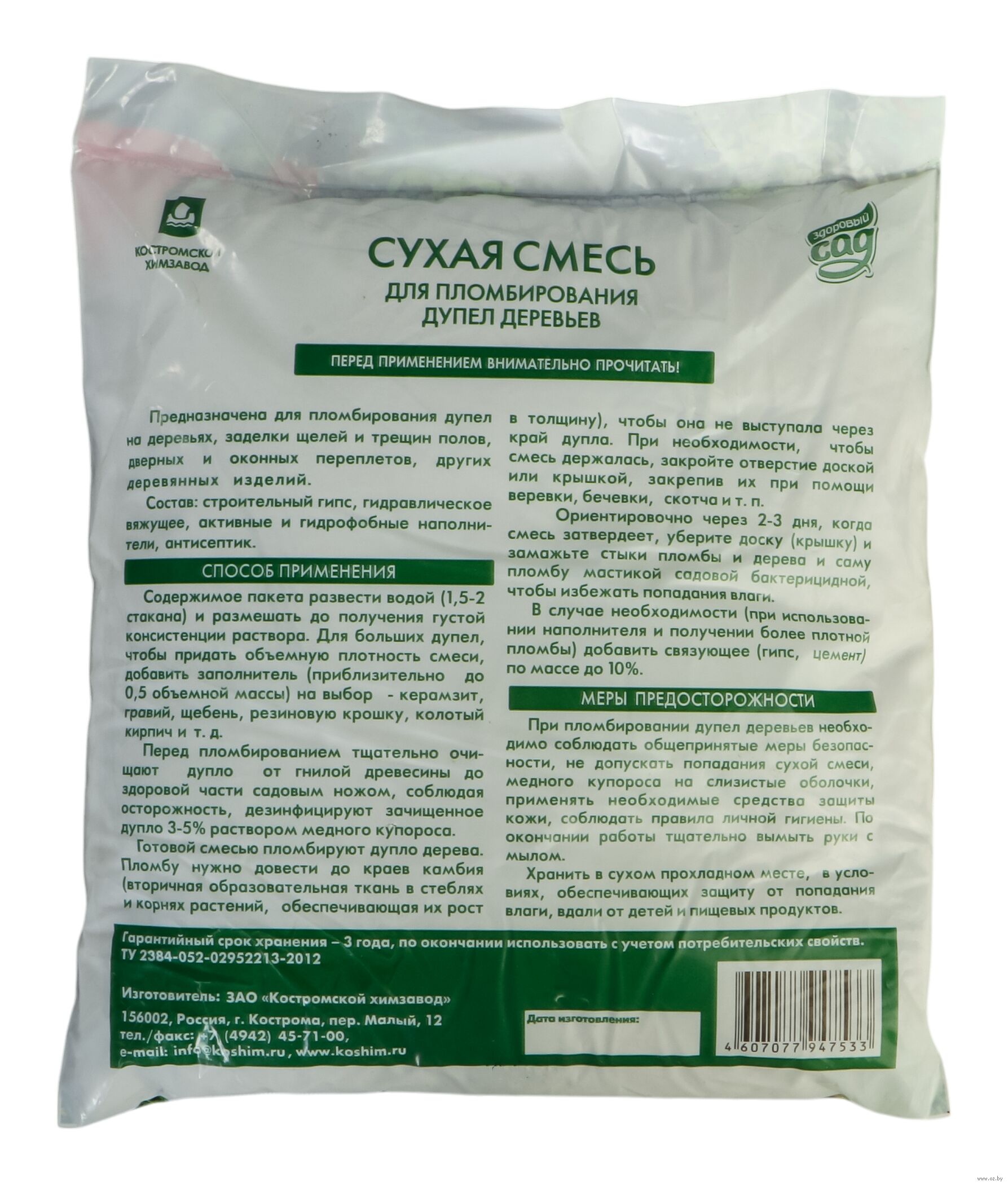 Сухая смесь для пломбирования дупел деревьев предназначена для лечения ран деревьев, заделки щелей и трещин деревянных полов, дверных и оконных переплетов и других деревянных изделий.