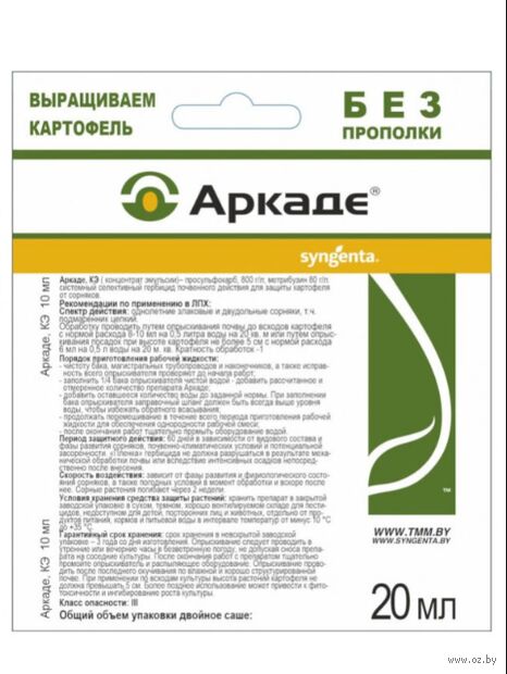 Высокоэффективный комбинированный гербицид для защиты картофеля от однолетних злаковых и двудольных сорняков, в т.ч. подмаренника цепкого, проса куриного, видов ромашки, паслена черного, мари белой, горцев и других трудноискоренимых и вредоносных видов. Эффективен на всех типах почв, при разных сроках посадки и технологий возделывания культуры.
