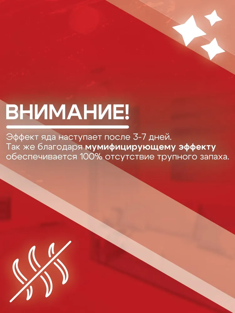 Тесто-брикеты имитируют растительную и животную пищу, чем и привлекают грызунов. Мягкая масса в виде теста, содержащая Активное действующее вещество и комплекс добавок, упакована в индивидуальные пакетики из фильтр-бумаги и позволяет легко дозировать приманку, не контактируя с ней. Активное действующее вещество последнего поколения обеспечивает гибель грызунов на 3-7 день после однократного поедания ими приманки.