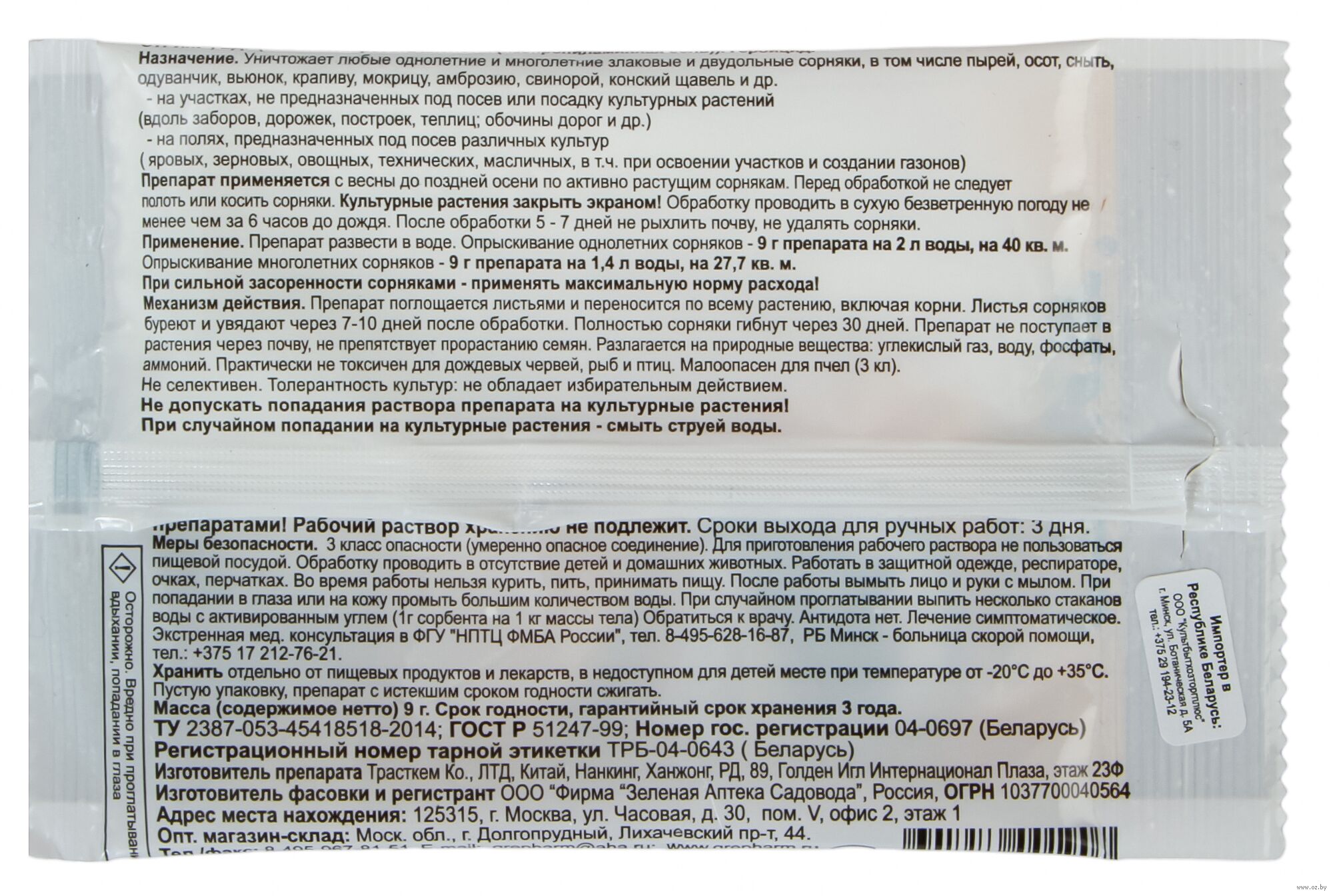Применение: опрыскивать зеленые сорняки в любое время года с весны до поздней осени.