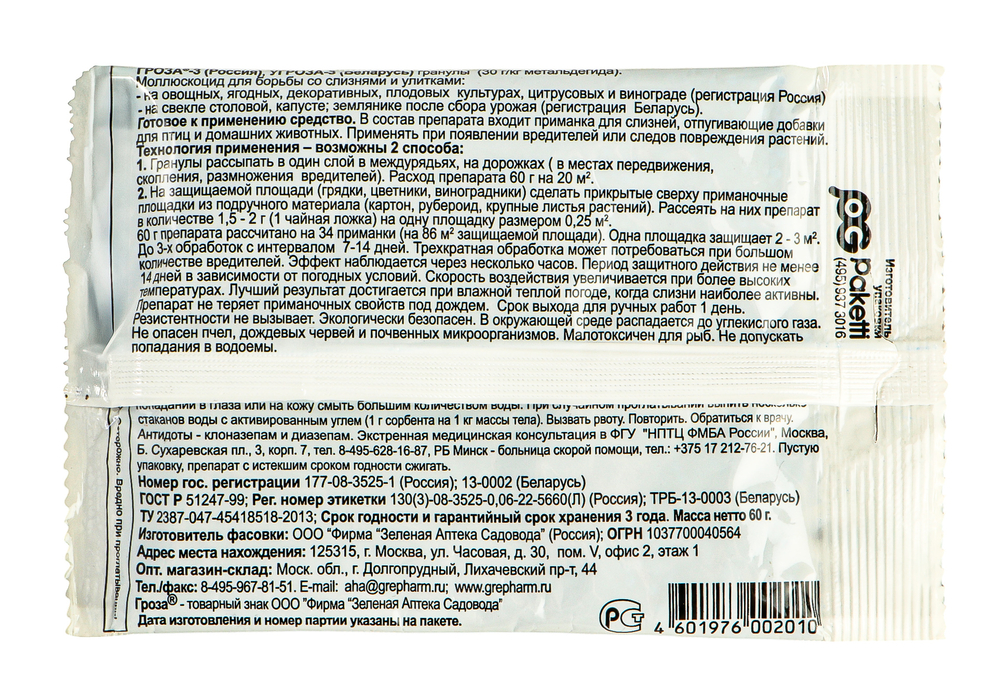 Средство для борьбы с улитками и слизнями на овощных, ягодных, декоративных культурах, винограде.