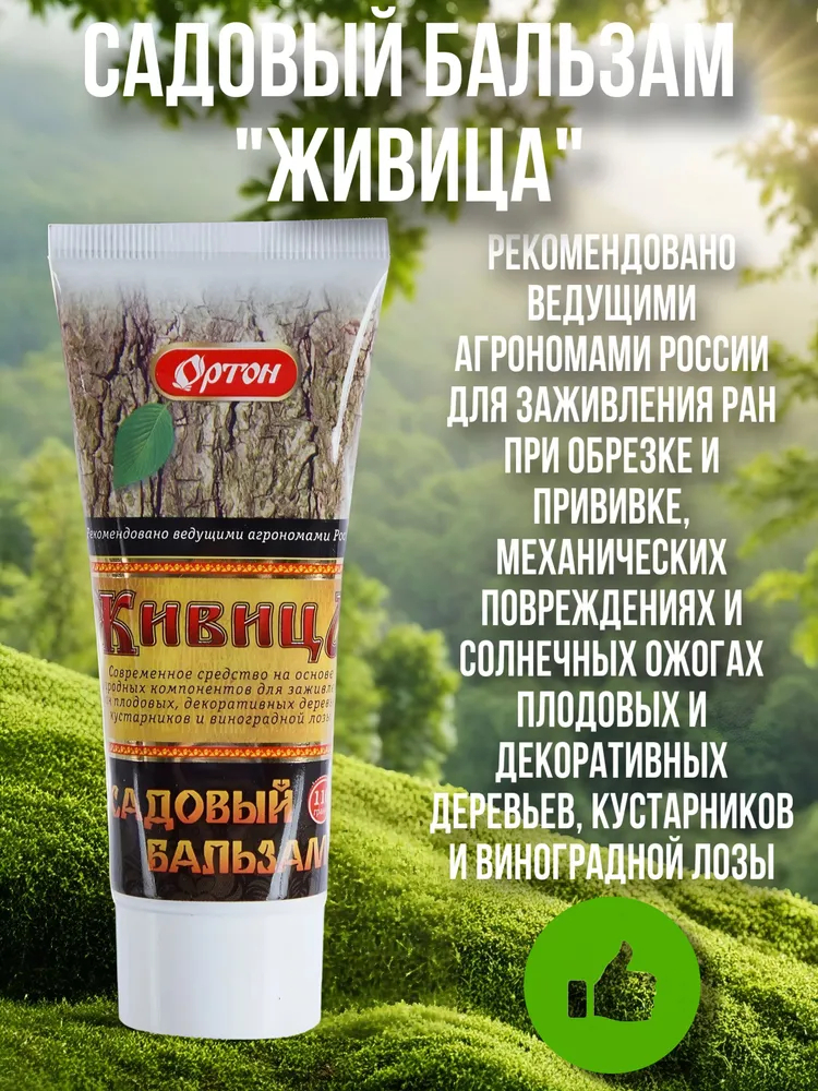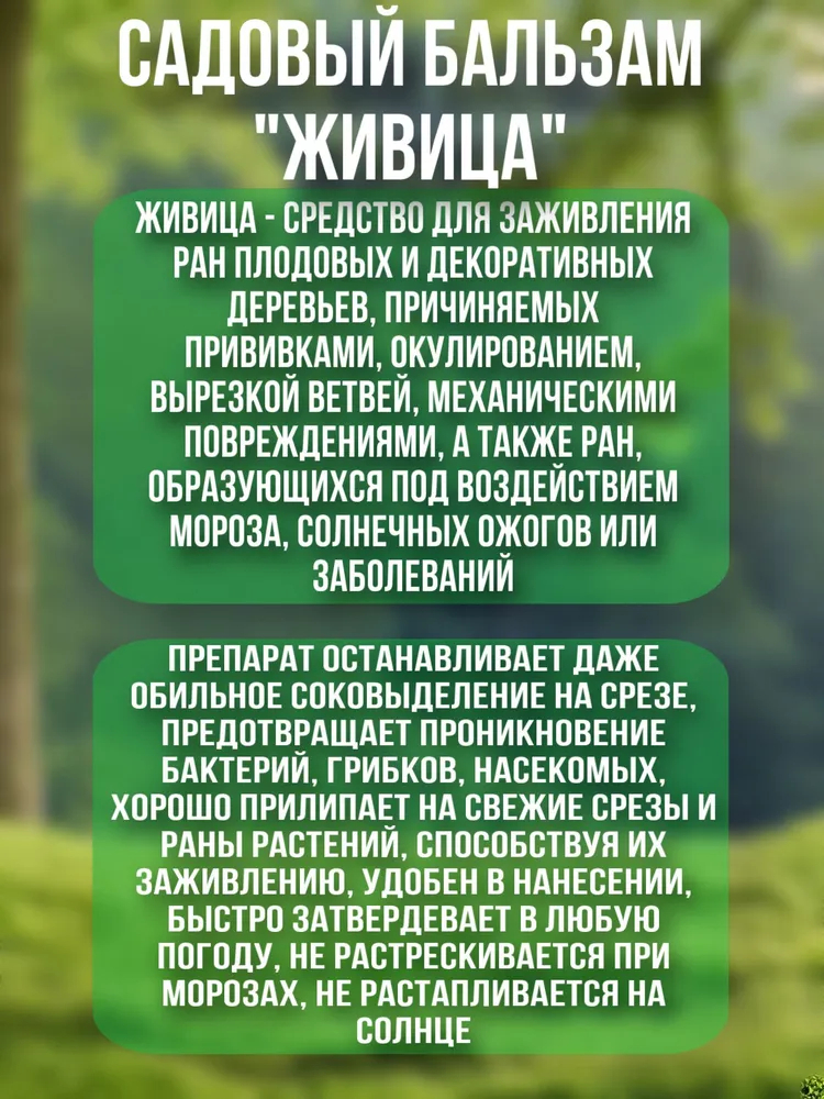Садовый бальзам на основе природных компонентов для заживления ран при обрезке и прививке, механических повреждениях и солнечных ожогах плодовых и декоративных деревьев, кустарников и виноградной лозы.