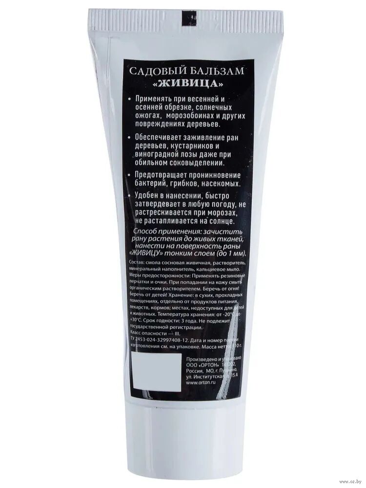 Способ применения: зачистить рану растения до живых тканей и нанести на ее поверхность "Живицу" тонким слоем (1-3 мм). Садовый бальзам "Живица" готов к применению, его не надо нагревать, он не растрескивается на морозе, быстро затвердевает в любую погоду. Перед применением рекомендуется размять трубу в руках.
