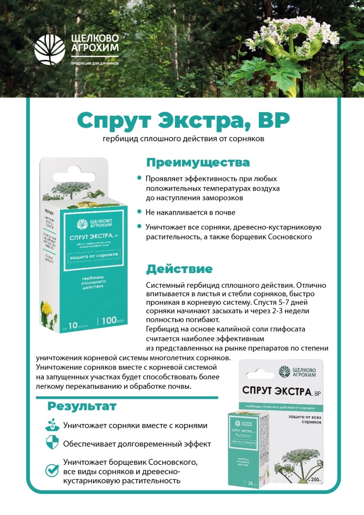 Препарат "Спрут Экстра, ВР" – системный гербицид сплошного действия. Уничтожает все виды травянистой и древесно-кустарниковой растительности. Он отлично впитывается в листья и стебли сорняков, быстро проникая в корневую систему. Спустя 5-7 дней сорняки начинают засыхать и через 2-3 недели полностью погибают.