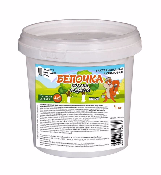 Краска для садовых деревьев, водно-дисперсионная акриловая применяется для защиты стволов и ветвей садовых деревьев, декоративных деревьев и кустарников от солнечных ожогов, насекомых-вредителей, зимующих в трещинах коры, спор грибов-патогенов, грызунов. Образует прочное белое, матовое, "дышащее" покрытие, которое не препятствует воздухообмену, устойчиво к атмосферным осадкам.
