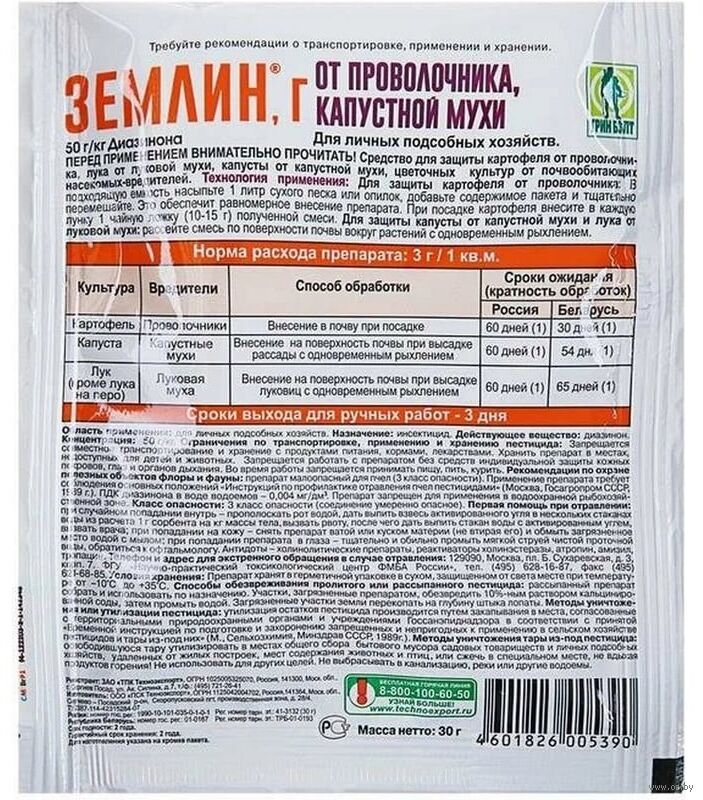 Специальное средство от проволочника на картофеле и других корнеплодах. Препарат смешивают с песком или опилками и вносят в почву при посадке картофеля. Также успешно применяется от капустной мухи, почвообитающих вредителей цветов.