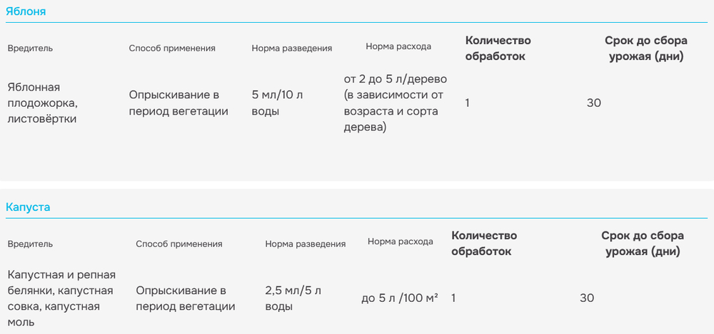 Вызывает быструю гибель вредителей в течение 0,5-2 часов. Обладает хорошим отпугивающим эффектом, тормозит откладку яиц у взрослых насекомых и нарушает процесс питания у личинок. Имеет длительный период защитного действия.