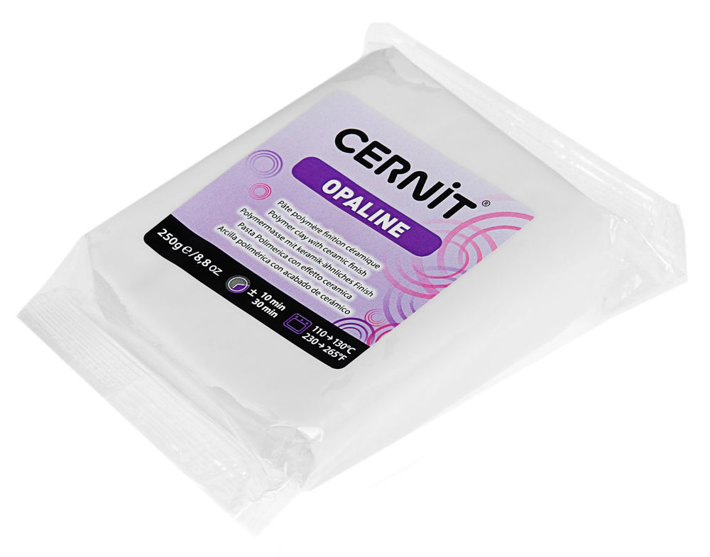 Cernit Opaline – запекаемая полимерная глина для изготовления бижутерии, декора, кукол, миниатюр. Из-за пониженного содержания пигментов имеет полупрозрачный (фарфоровый) эффект. Легко смешивается между собой, послушная в работе. Текстура пластики плотная, но после разминания быстро становится однородной, пластичной, податливой, хорошо держит форму, не прилипает к рукам и инструментам.