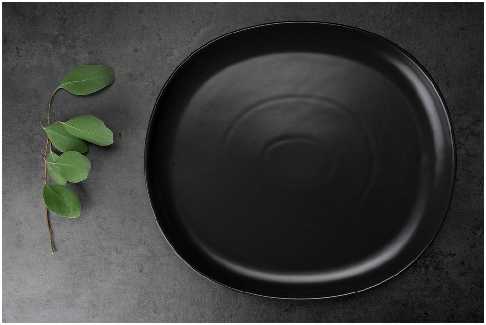 Изделие представляет собой плоскую тарелку с завышенными бортами овальной формы. Дизайн выполнен в выдержанных однотонно-матовых цветах, стиль modern. Блюдо изготовлено из высококачественного экологически безопасного материала – керамика.