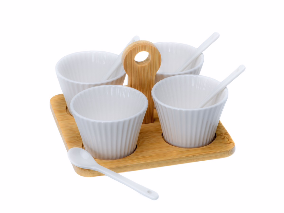 Набор салатников керамических с ложками на бамбуковой подставке. Используется по назначению для сервировки стола и приёма пищи. Помыть перед первым использованием.