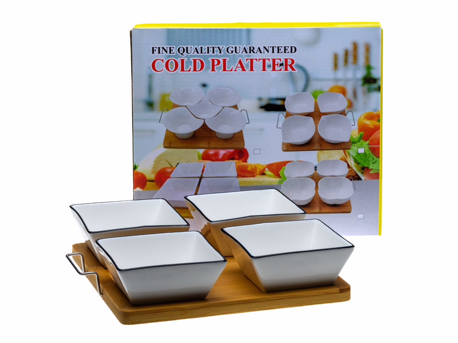 Набор салатников керамических на деревянной подставке. Используется по назначению для принятия пищи и сервировки стола. Помыть перед первым использованием.