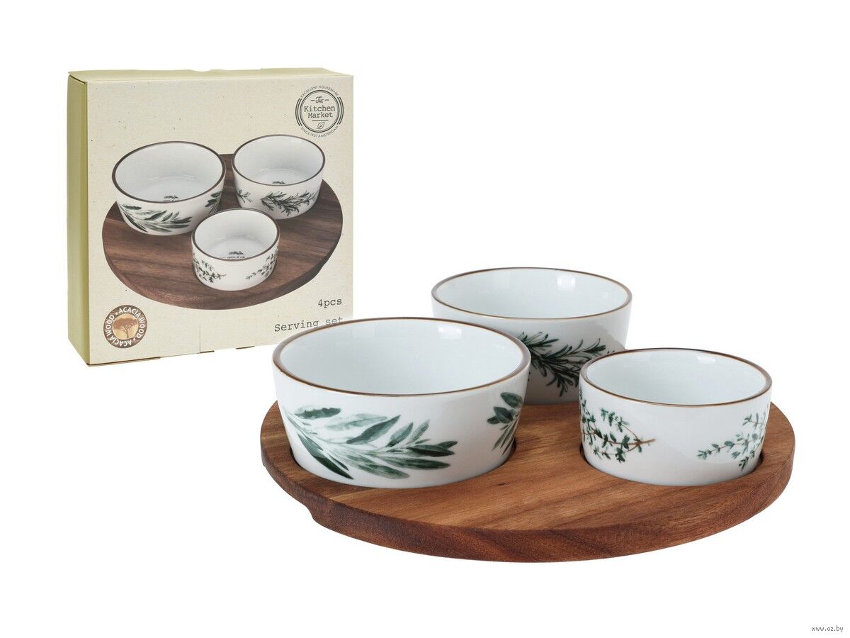Набор салатников керамических на деревянной подставке. Предназначена для сервировки стола. Перед и после использования вымыть и тщательно высушить.