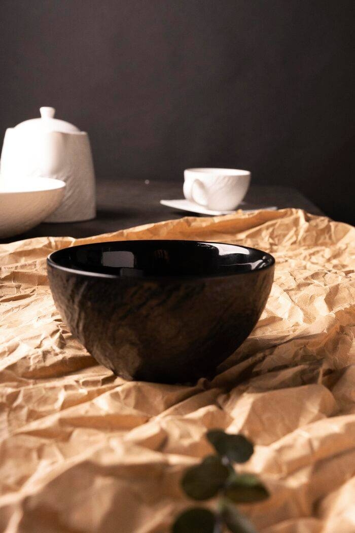 Тарелка изготовлена из высококачественного фарфора, покрытого слоем глазури черного матового цвета. При этом покрытие глазурью осуществляется вручную, благодаря чему тарелка уникальна и неповторима.