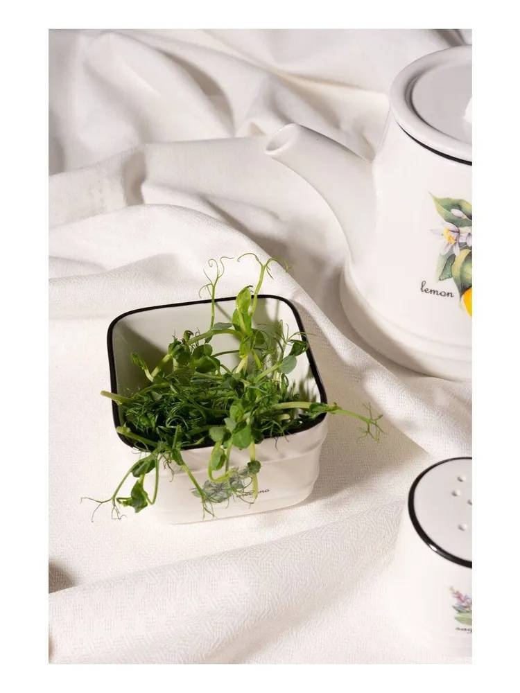 Коллекция выполнена на качественном белом фарфоре. Этот материал экологичен и безопасен для продуктов.