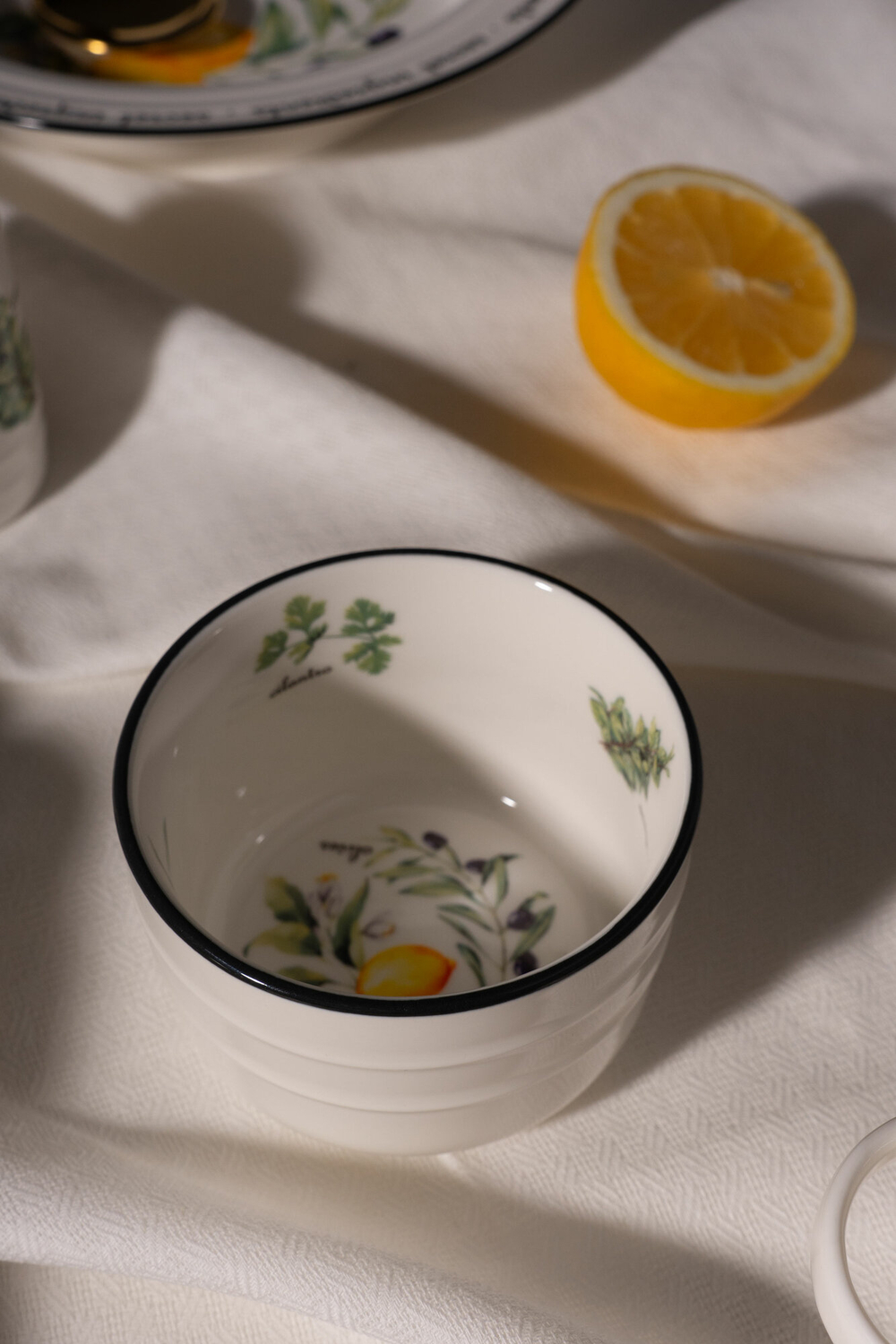 Коллекция выполнена на качественном белом фарфоре. Этот материал экологичен и безопасен для продуктов.