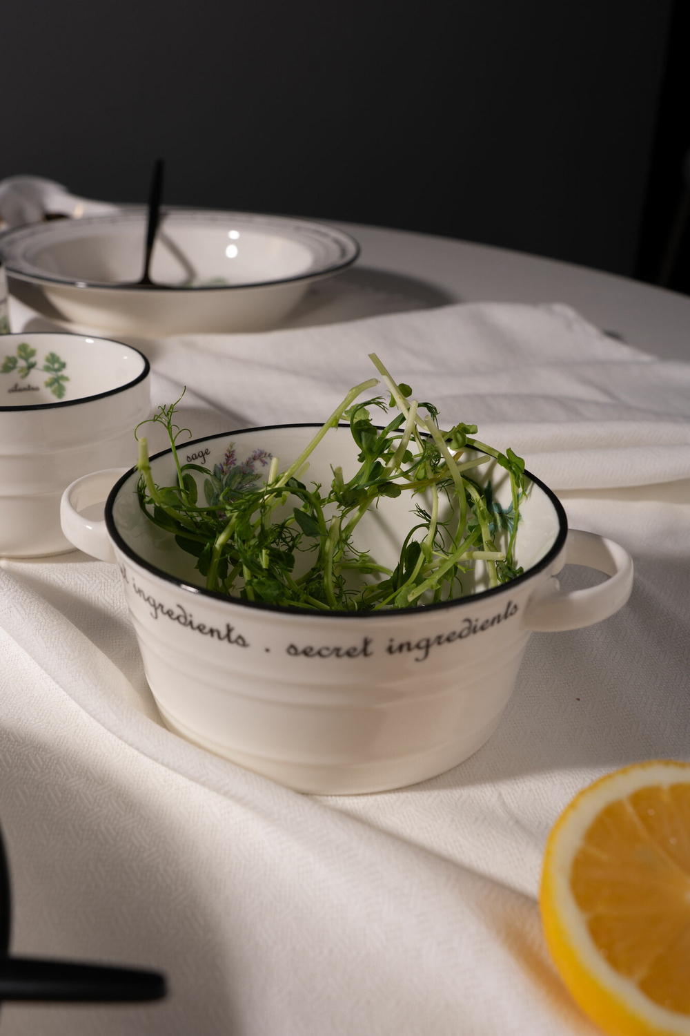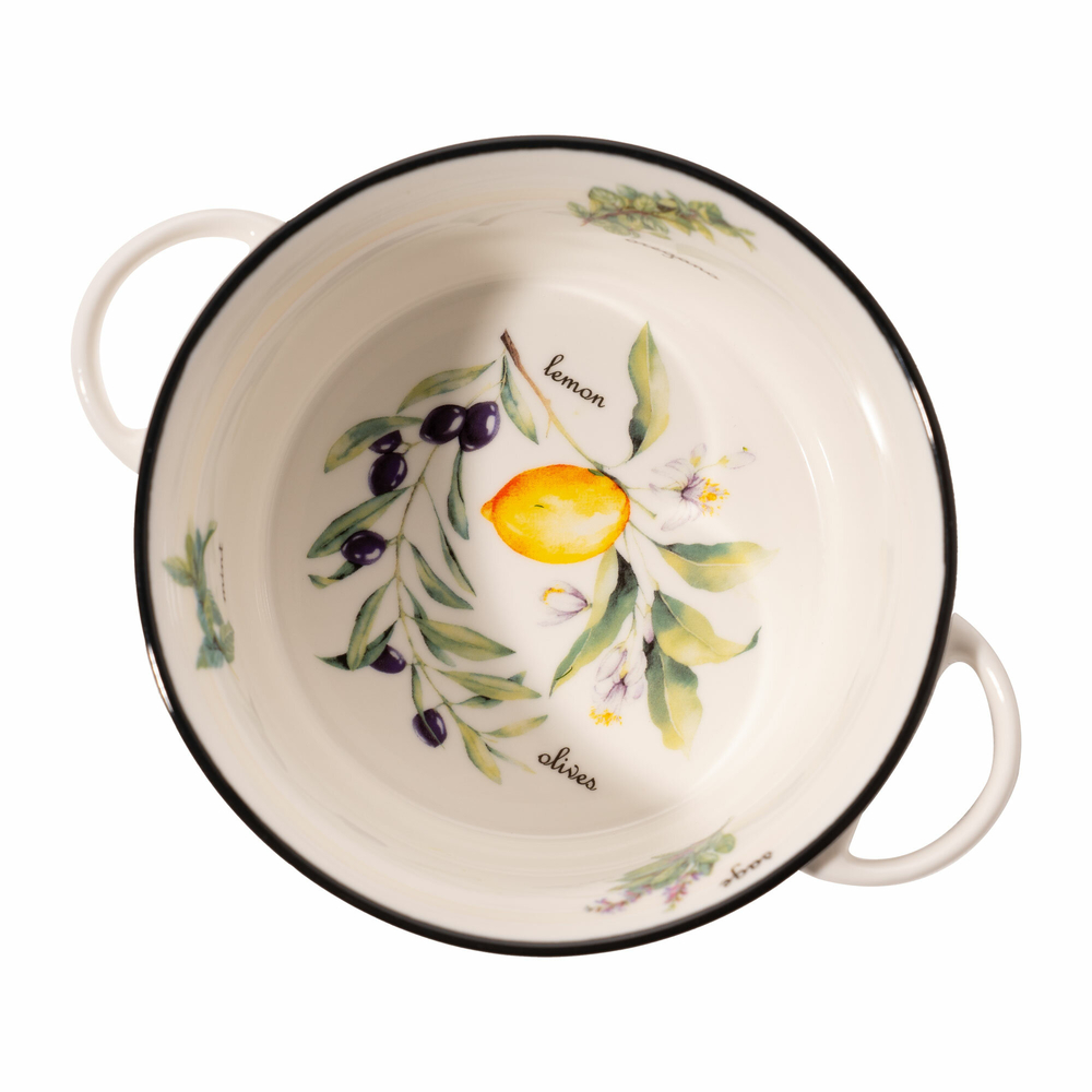 Коллекция выполнена на качественном белом фарфоре. Этот материал экологичен и безопасен для продуктов.