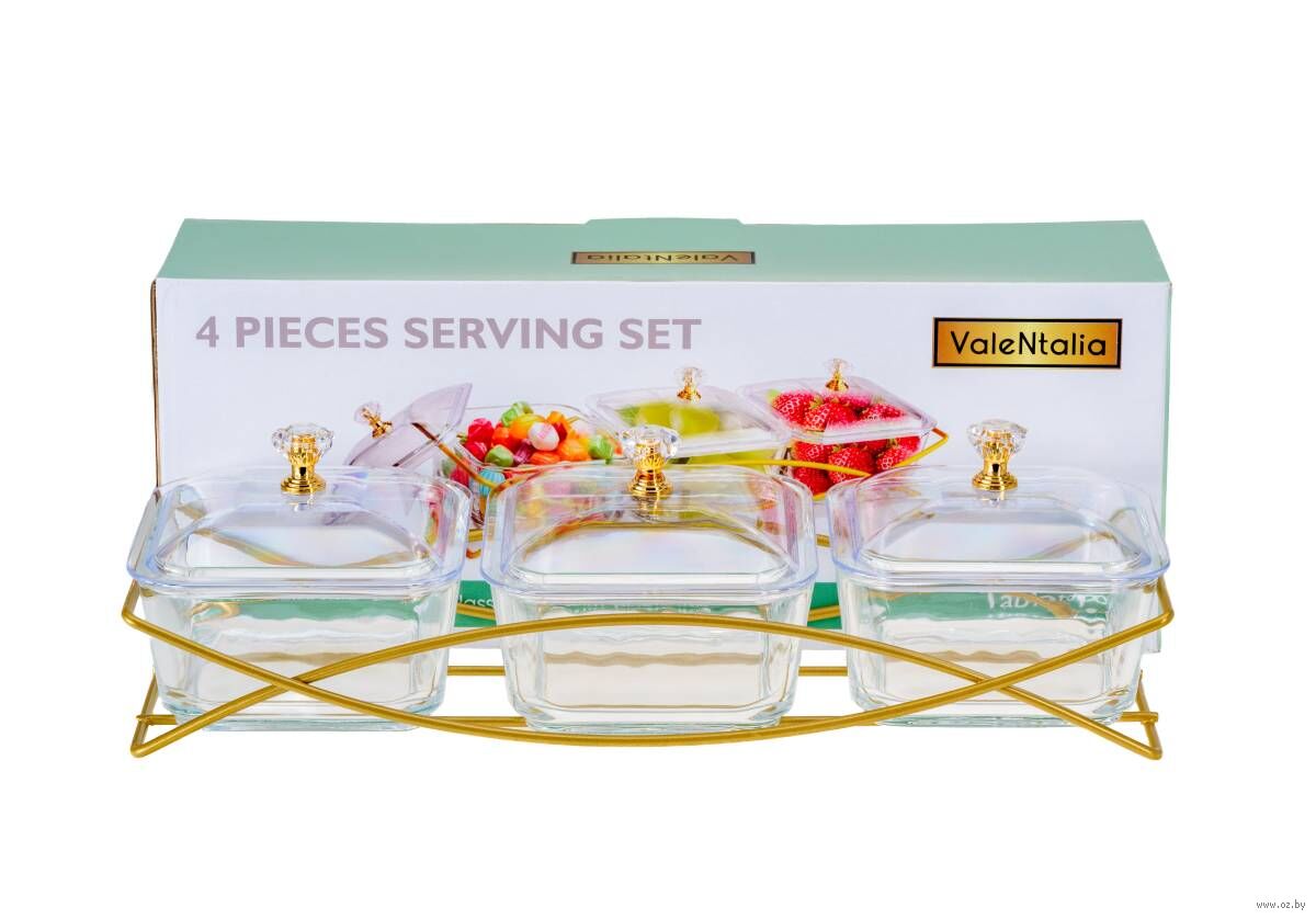 Набор салатников стеклянных с пластмассовыми крышками на подставке.