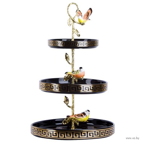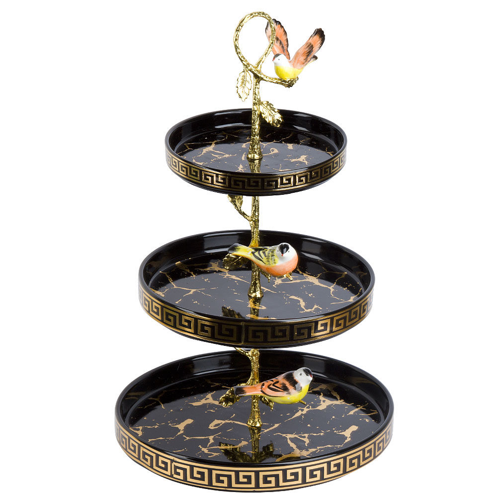 Блюдо-этажерка используется для красивой выкладки фруктов, ягод и сладостей. Изделие выполнено из фарфора, который обладает механической прочностью, не деформируется и не трескается, сохраняет свой вид и цвет длительное время. Благодаря оригинальному дизайну блюдо украсит любой стол.