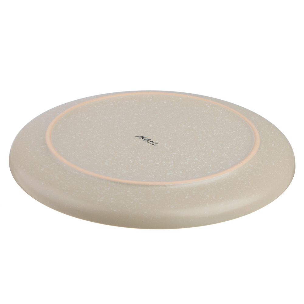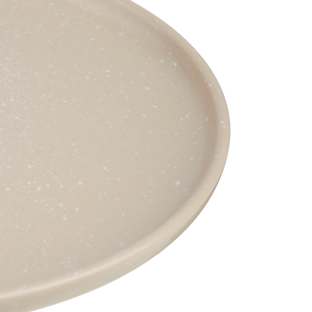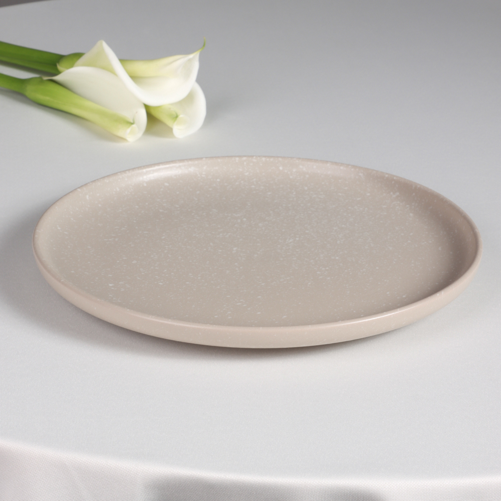 Тарелка выполнена из высококачественной керамики повышенной прочности. Бежевый цвет с фактурой под камень смотрится оригинально и в то же время неброско, добавляя изюминку в оформление стола.