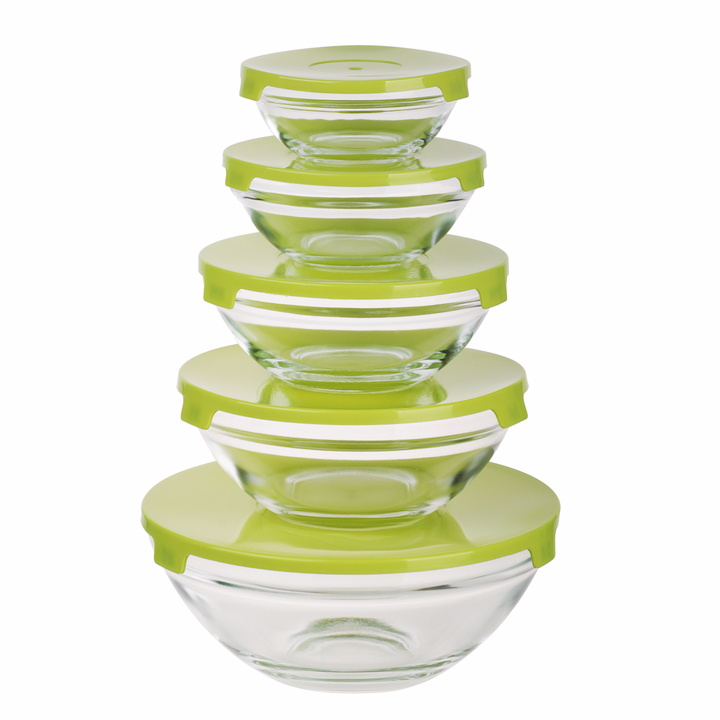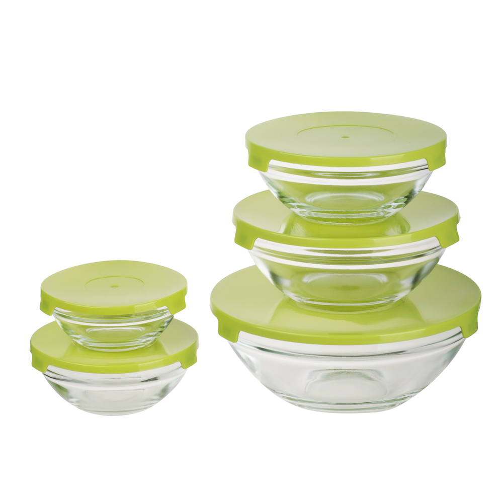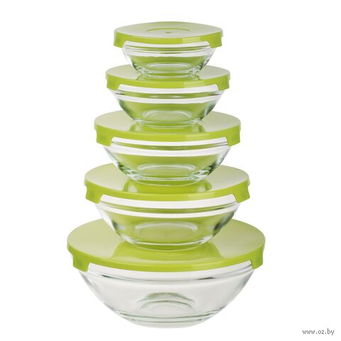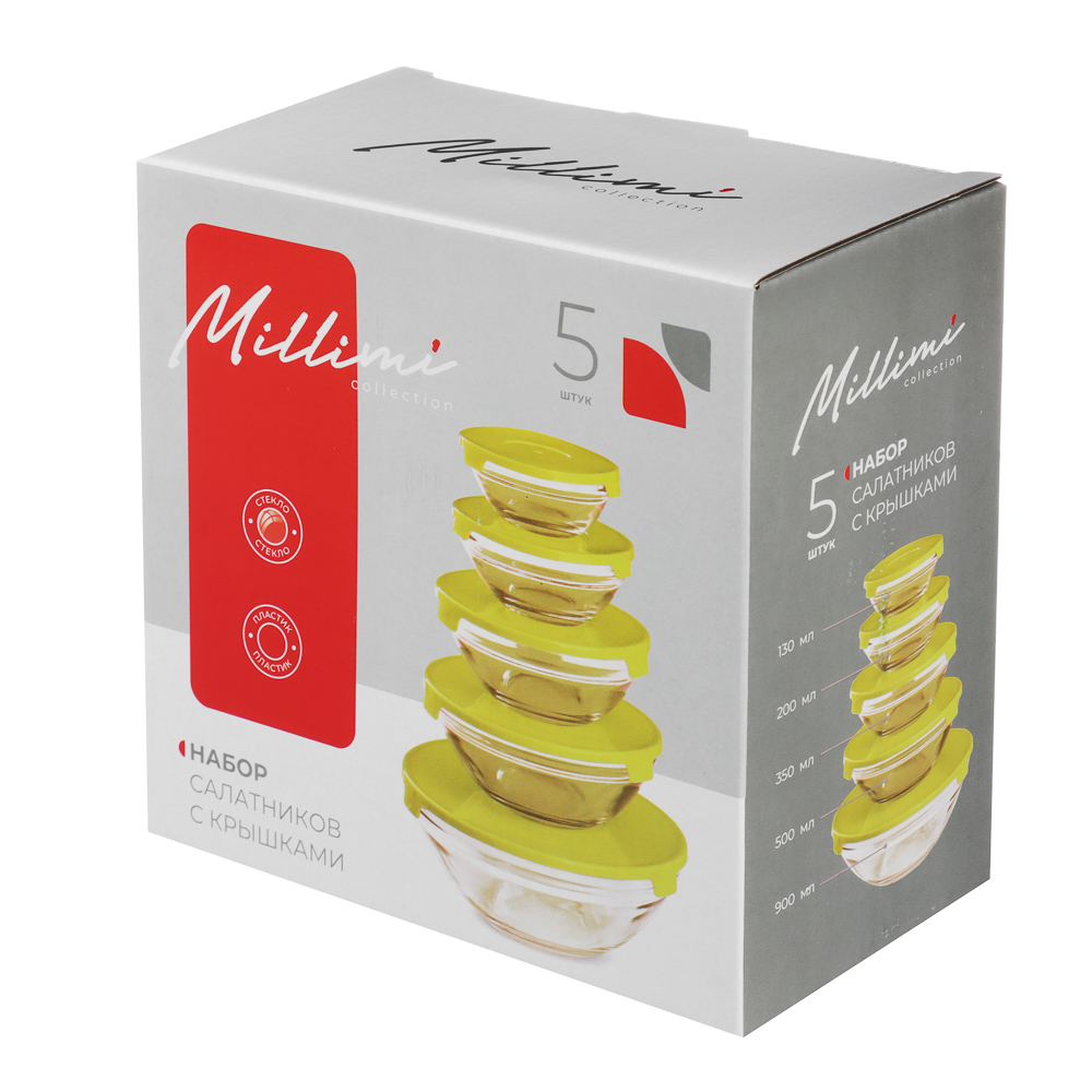В набор входят салатники самых востребованных объемов: 130 мл (для соусов и меда), 200 мл (для порции салата или ягод), 350 мл (для гарниров), 500 мл (для салатов на компанию) и большой контейнер на 900 мл (для объемных блюд и маринадов).